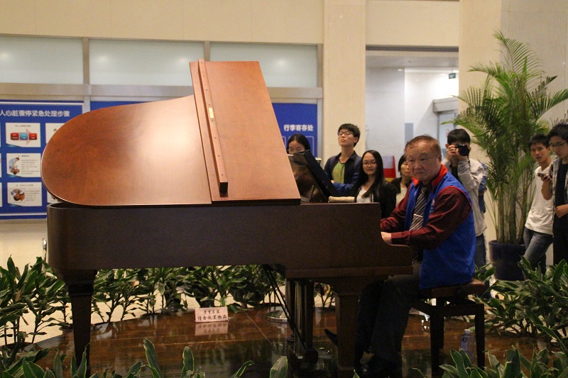 走出新教,大致结束了教学区的参观,引导同学又带领我们来到了就在隔壁的著名的交大附属瑞金医院门诊部。一进门诊部,便传来了一短悠扬的钢琴独奏,走近一看才发现门诊大厅中央一位年迈的志愿者爷爷正沉醉在自己的演奏之中,为大家带来了美得享受。医院的人性化关怀,和爷爷的无私奉献带给了我们无限的启发。