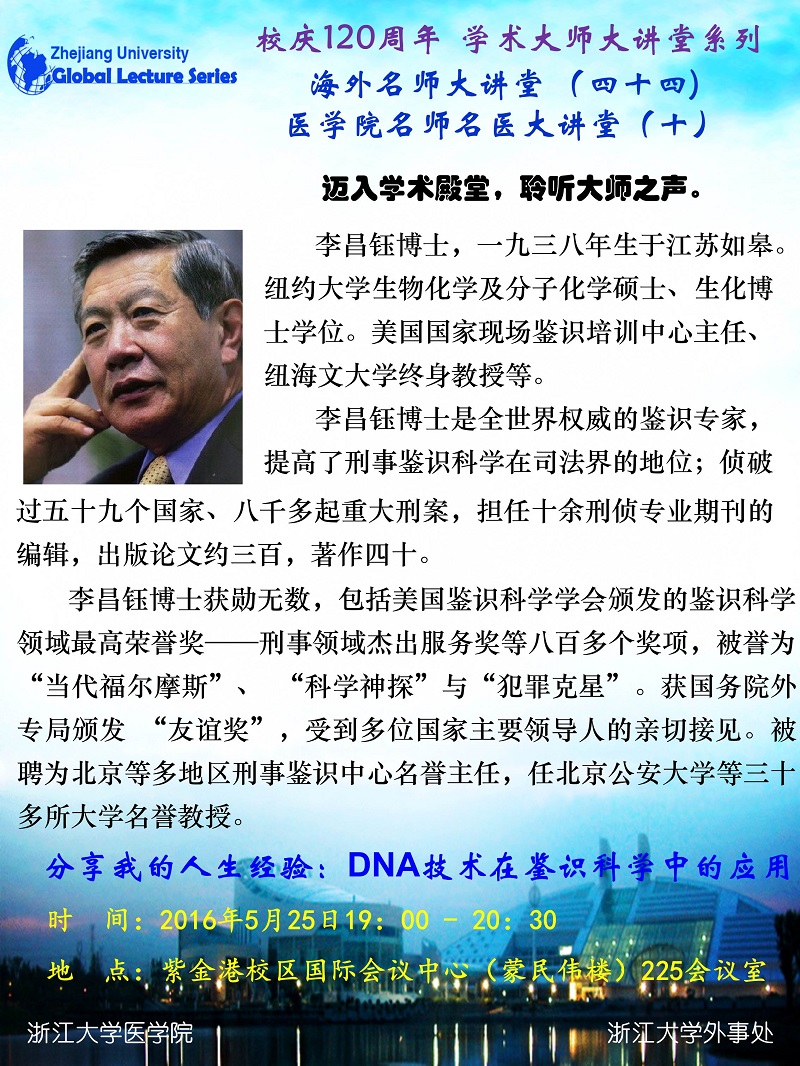 浙江大学海外名师大讲堂(44)暨医学院名师名医大讲堂(10)——李昌钰博士报告会