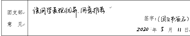6.考虑到部分未返校学生无法按时上交纸质版,此次评优工作中推荐表只需要交电子版,团支部意见栏请采用电子签名,效果可参考下图(提示:可扫描/拍照后采用设置图片透明色或黑白效果等方法)