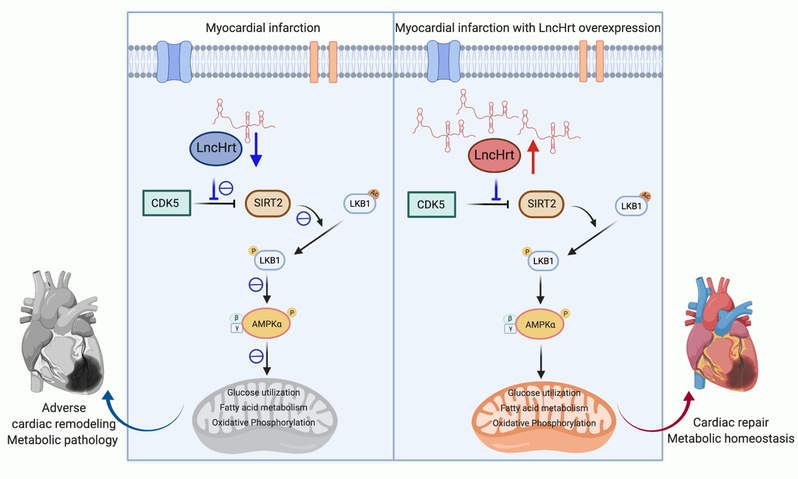 研究发现,在心梗后心脏中长链非编码RNA LncHrt表达显著下调,增加了CDK5SIRT2的相互作用,并伴随着LKB1-AMPK信号通路的抑制。在心梗心脏中通过AAV9补偿LncHrt的表达,LncHrt通过干扰CDK5SIRT2活性的抑制促进SIRT2下游的LKB1-AMPK信号通路的激活。激活的AMPK调控心脏的能量代谢稳态,进而缓解心梗后心脏的病理重构过程,保护心脏功能,阻止心力衰竭的发生。该研究鉴定了心肌富集的LncHrt为心脏代谢的调节分子,通过调控代谢信号通路,保护心脏损伤后的结构与功能。并且AAV9介导的LncHrt可以作为基于RNA治疗缺血性心脏疾病的有效靶点。