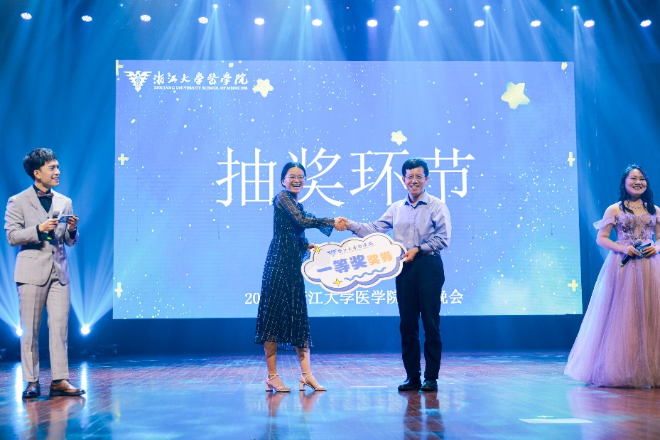 第二篇章为“饮水思源,知己难忘”,既是饮水思源,感恩母校的培育;也在回忆同窗数载,那些难忘知己的陪伴。《赤伶》的乐声里,是对母校和对医学事业的崇高敬意;《毕业之歌》的串烧中,是少年们一路相伴而行的快乐时光;《浙一路,我们走过》的朗诵声中,是对医学生未来的祝福与期盼;《浙大儿院的日子》歌声里,是毕业生一路走来的点滴日常。抽奖环节,李晓明为获得一等奖的同学颁奖。