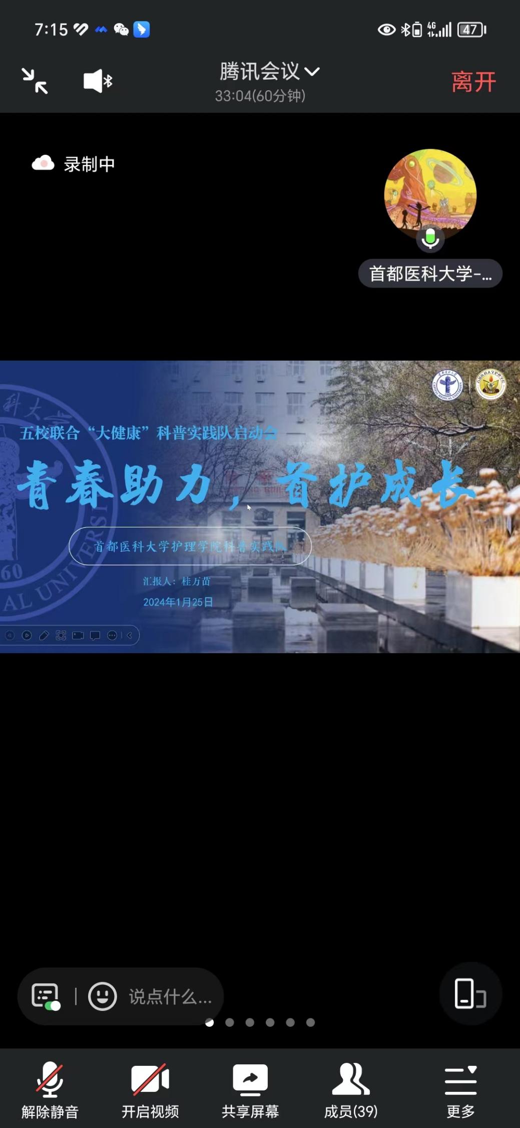 青春助力,首护成长。首都医科大学护理学院康楠茜老师说,“护理学是非常重要的学科,充分发挥在健康护理方面的专业优势,为大众提供专业护理知识科普,服务人民所需,是我们首都医科大学护理学院的实践队目标”。接着,桂万苗同学介绍了实践队的工作基础以及下一阶段工作计划。包括聚焦老年特点,深入社区一线,与北京相关机构合作,共创老年友好社区大学生志愿公益讲座活动,守护家庭健康。赴青海省,陕西省、北京市等地开展了慢病管理、医养结合妇幼保健知识的知识宣讲。而下一阶段,则充分发挥护理专业特色,彰显首护青年服务国家和社会的担当,聚焦中小学生群体,助推一老一小健康管理,普及健康生活理念,加强校际间交流合作,促进共同进步,奋进健康中国战略。